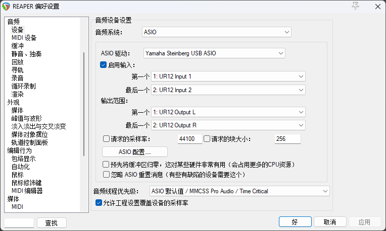 比如这里我的声卡是 YAMAHA UR242. 那么在 REAPER 偏好设置中,ASIO 驱动就选择 Yamaha Steinberg USB ASIO.