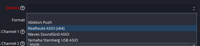 - OBS Channel 2: 选择之前设置的 ReaRoute ASIO 组合中的另一个通道作为右声道。(所以这个例子里就是 ReaRoute REAPER=>CLIENT 2)